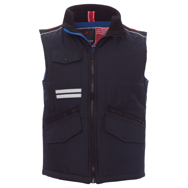 Vesta de lucru unisex, cu detalii practice si un design ergonomic. Dotata cu un fermoar de 8 mm din plastic, completat de un cursor metalic si nasturi din plastic pentru inchidere sigura, aceasta vesta ofera functionalitate si stil. Spatele profilat si inclinarea buzunarelor faciliteaza confortul in timpul purtarii, iar benzi reflectorizante asigura vizibilitate in conditii de lumina redusa. Jacheta este dotata cu doua buzunare exterioare LOCK SYSTEM si doua cu fermoare, precum si un buzunar pe piept pentru smartphone si un inel suport pentru ecuson. In interior, captuseala vatuita si fleece-ul contrastant pe spate si guler adauga confort suplimentar, iar buzunarul interior cu fermoar faciliteaza personalizarea cu imprimare serigrafica sau broderie.