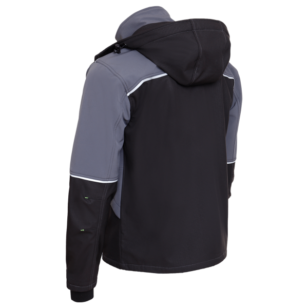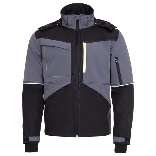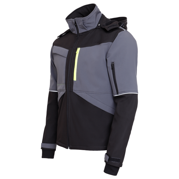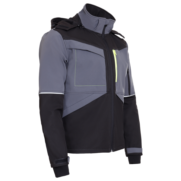 Jacheta softshell cu gluga detatabila, reglabila. inchidere cu fermoar; doua buzunare laterale cu velcro, un buzunar in zona umerilor, precum si un buzunar la piept cu fermoar; buzunar ascuns la piept cu clapeta; posibilitatea de a fixa mansetele cu velcro; elemente reflectorizante. Material: 96% poliester/ 4% spandex, softshell cu membrana TPU si fleece, 280 g/m²